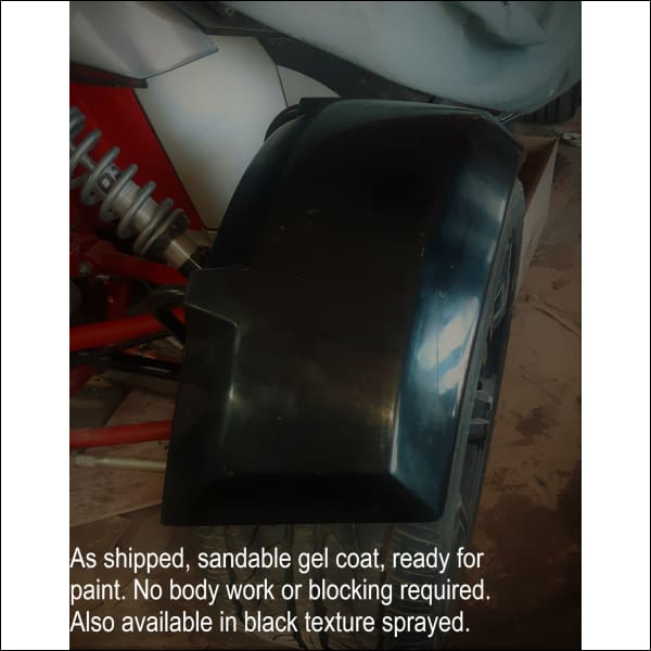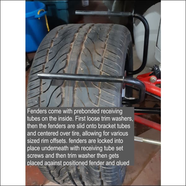 Using black steel tubular brackets these fenders mount to the sides of the vertical upright’s post using the two steel offset bracket bolts for the upper control arm allowing a tight tire fit outboard of the shocks.